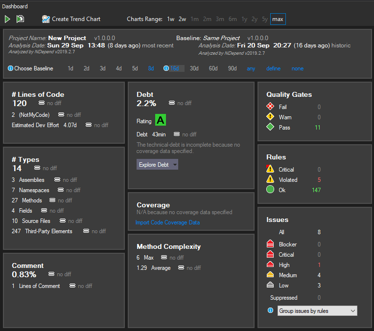 The dashboard is at the centre of everything NDepend does. It provides you with a full breakdown of your project, from types analysis, to method complexity and potential issues that need to be investigated.