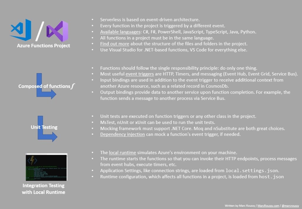 I wanted the guide to be as visual as possible, so instead of a long blog post, I’ve structured it into PDF format so that it’s easy to view, absorb, and get to work. The first page is an overview of the Azure Functions development model, and the subsequent pages fill in the gaps with additional information. For those occasions when you need more detail, I’ve added links to other blog posts here and elsewhere on the web.