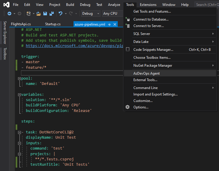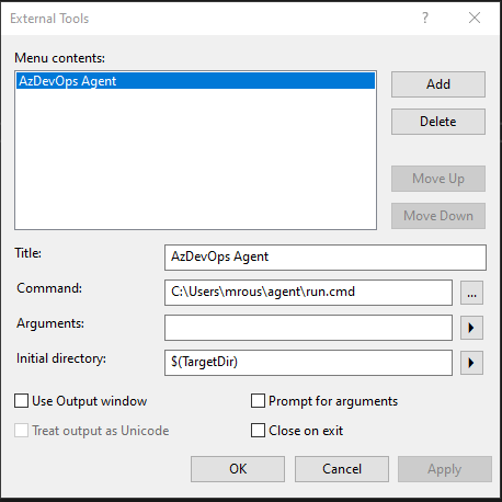 The agent’s installer gives you the option to run it on demand or as a Windows service. I chose on demand since I don’t need the agent all that often. I added an external tool to Visual Studio so that it’s never more than two clicks away to launch it: