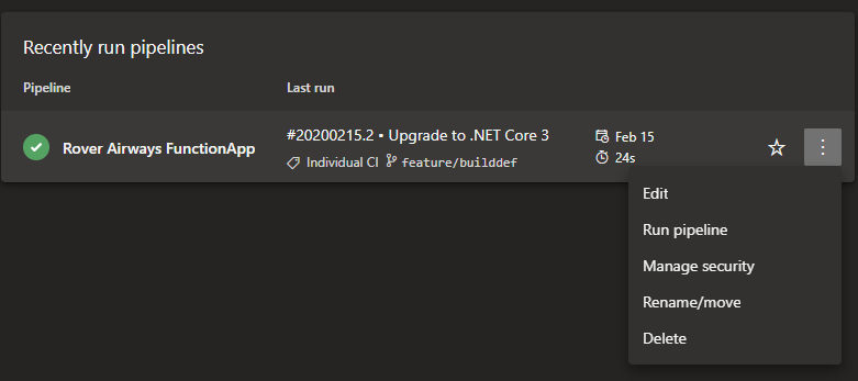 Side Note: A pipeline automatically gets the same name as the repository in which it’s committed, regardless of the filename you give it. In some scenarios, it can be useful to give the pipeline a more descriptive name. You can rename the pipeline by hovering over it, then clicking on the three dots that appear to choose Rename/Move.