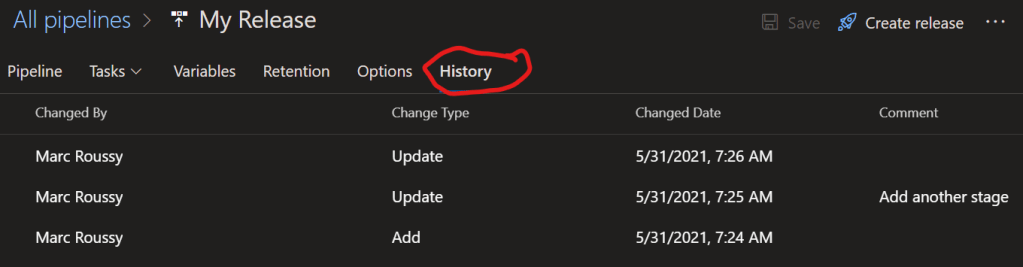 If you’re still using the visual designer for builds or releases, it’s also relatively easy to look at the history of the file by going to the History tab: