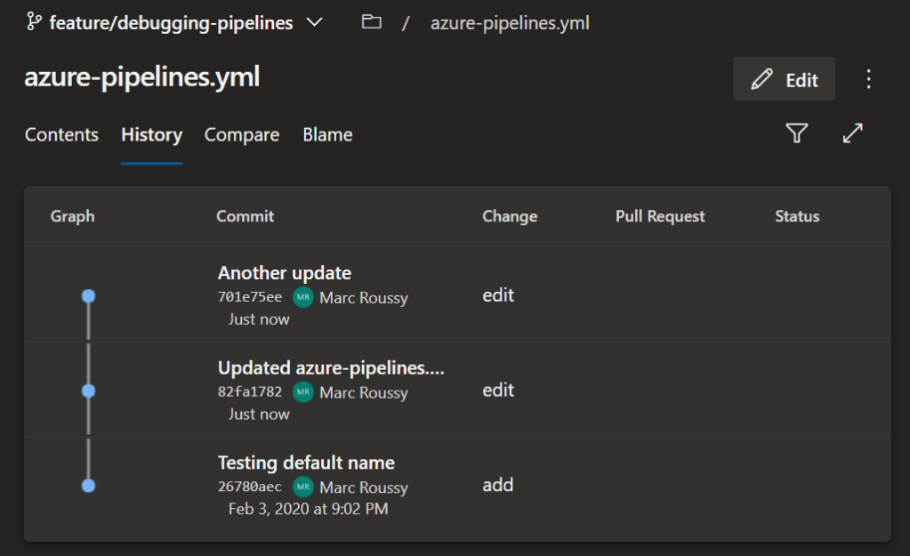 A really baffling failure will require you to take your investigative skills to the next level by digging into any changes that have been made to the pipeline. It’s easy to check the history of a YAML pipeline since it’s just another file committed to the Git repository: